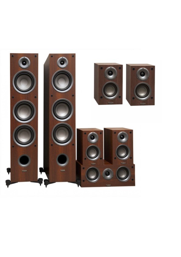 Továbbfejlesztett kettős 6,5”-es (165 mm-es) mélysugárzó meghajtók – ultrakönnyű polipropilén kúp elasztikus gumi felfüggesztéssel, Φ90 mágneses szerkezettel, nagy teherbírású hangtekerccsel és merevebb meghajtóvázzal bevont tekercsformázóval, hogy ellenálljanak a nagyobb teljesítmény kezelésének és a hosszabb működési időnek anélkül, hogy növelnék a meghajtó hőmérsékletét, ami mélyebb, zeneibb és precízebb basszusreakciót eredményez. A lapos porvédő sapka támogatja a levegő áramlását és egyenletesebbé teszi a frekvenciaválaszt.Hangfalszett műszaki adatai:Frontsugárzó TAV-607F (2 db):20-120W,40-25.000Hz,,98x21x29cm,19,2kg/pár, 91dB,6 Ohm,1x25mm magas,1x165mm közép,2x165mm mélysugárzóCentersugárzó TAV-C (1 db):20-100W,55-25.000Hz,16,5x43x14,5cm,3,58kg,88dB,6 Ohm1x25mm mgas,2x102mm középsugárzó,falra akaszthatóHáttér sugárzók TAV-S (4db):20-100W,55-25.000Hz,26,5x16,5x14,5cm,5,0kg/pár,86dB,6 Ohm, 1x25mm magas, 1x102mm mély/közép sugárzó, falra akasztható